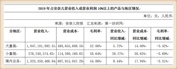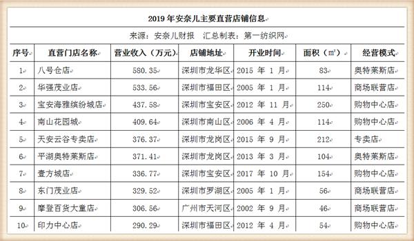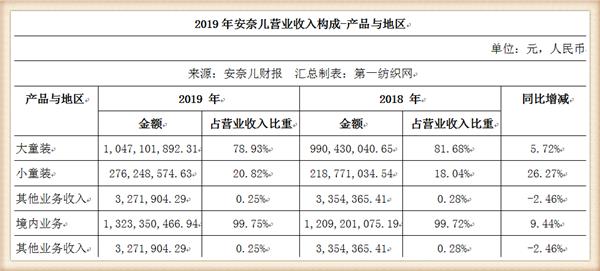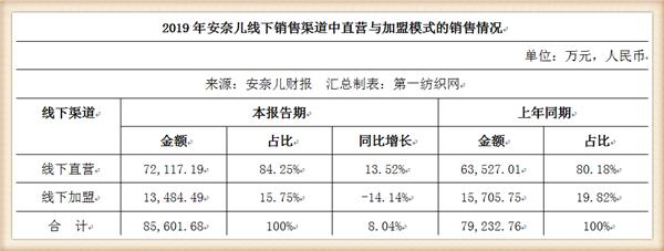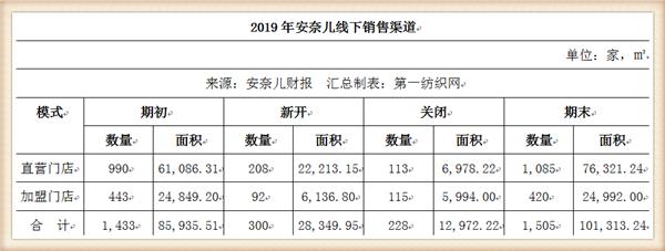 财报显示,2019年,安奈儿实现主营业务收入13.23亿元,同比增长9.44%,其中线上渠道实现主营业务收入4.67亿元,同比增长12.10%,线下渠道实现主营业务收入8.56亿元,同比增长8.04%;净利润4211.73万元,同比下降49.49%;截至2019年12月31日,公司已在全国31个省、自治区及直辖市建立了1505家线下门店,其中直营店1085家,加盟店420家。