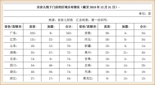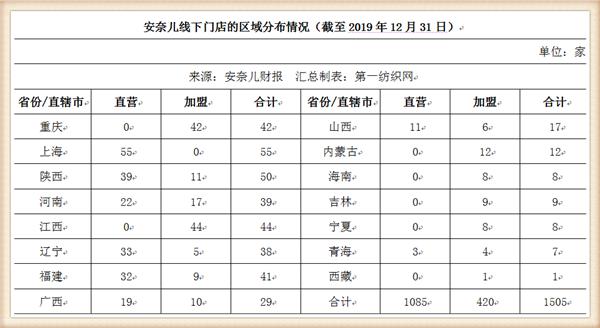 截至2019年12月底,安奈儿已在全国建立1505家零售门店,其中,直营门店数量达1085家,占线下门店总数的72.09%。
